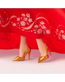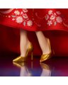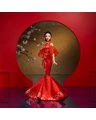 As the firecrackers ignite, Barbie steps into the Lunar New Year celebration in a lucky red qipao. She steals the scene in this quintessential dress with a modern mermaid gown silhouette, traditional mandarin collar, meihua plum blossom prints, and sheer bell sleeves that flutter as she claps to a festive lion dance. To complete her look, she wears golden earrings and a belt with lucky Chinese knot designs.